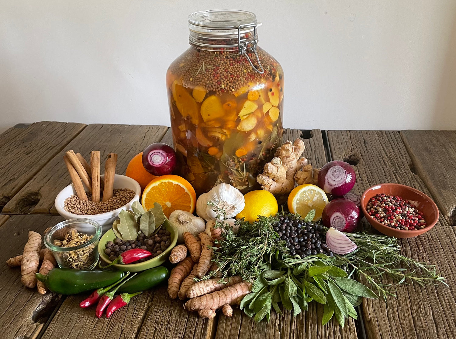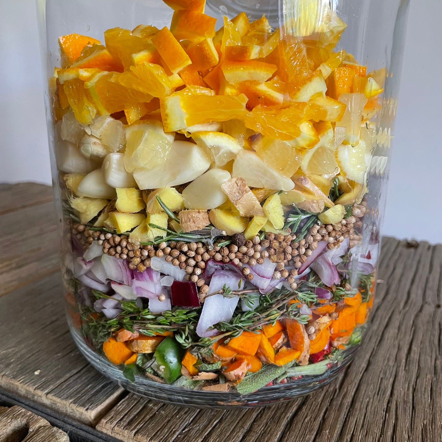 Ingredients - Apple Cider Vinegar (with the mother), Garlic, Ginger, Turmeric, Orange, Chilli, Fresh Thyme, Mixed Peppercorns, Allspice, Cinnamon Stick, Liquorice Root, Red Onion, Lemon, Coriander Seeds, Fresh Rosemary, Juniper Berries, Bay Leaf, Star Anise and Fresh Sage.