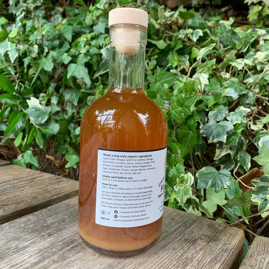 Ingredients - Apple Cider Vinegar (with the mother), Garlic, Ginger, Turmeric, Orange, Chilli, Fresh Thyme, Mixed Peppercorns, Allspice, Cinnamon Stick, Liquorice Root, Red Onion, Lemon, Coriander Seeds, Fresh Rosemary, Juniper Berries, Bay Leaf, Star Anise and Fresh Sage.