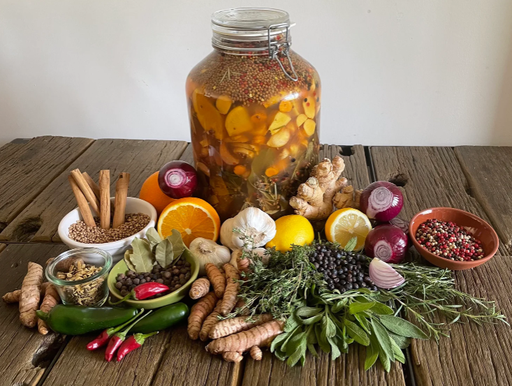 Ingredients - Apple Cider Vinegar (with the mother), Garlic, Ginger, Turmeric, Orange, Chilli, Fresh Thyme, Mixed Peppercorns, Allspice, Cinnamon Stick, Liquorice Root, Red Onion, Lemon, Coriander Seeds, Fresh Rosemary, Juniper Berries, Bay Leaf, Star Anise, Fresh Sage.